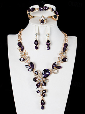 مجموعة مجوهرات 4PCS زجاج سبيكة الحلقات أقراط القلائد سوار نسائي أنيق عتيق ترف هندسي هندسي مجموعة مجوهرات من أجل زفاف مناسب للحفلات ضيف حفل زفاف