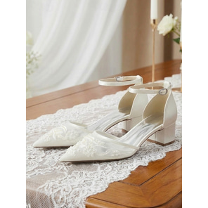 أحذية نسائية بكعب عالٍ مدبب من الدانتيل الأزرق الفاتح - تصميم أنيق ورومانسي، وكعب صغير مريح لحفلات الزفاف في المدينة وللعرائس العصريات.