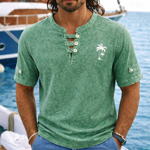 Homme Polo Chemise 100% coton délavée à l'acide Occasionnel Fête Sans Col Manche Courte Mode Basique Palmier Boutons Vintage Été Printemps Bleu Rouge Violet Vert Gris Polo