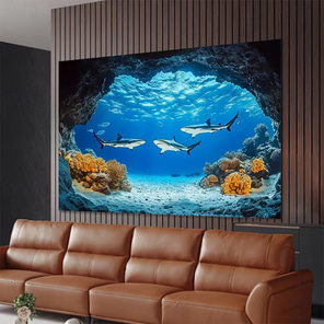 כריש לבן גדול עולם תת ימי תלת מימדי נוף מערה שונית אלמוגים אוקיינוס כחול אור שמש שטיח קיר תלוי רקע לחדר שינה לחדר משחקים לילדים חדר שינה חדר בנים עיצוב הבית אמנות קיר