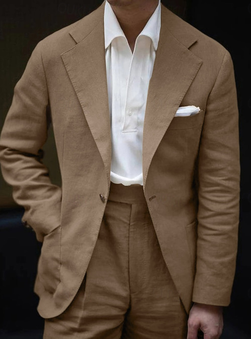 男性用 タキシード リネンスーツ ビーチウェディング カジュアル コーヒー 春、夏、秋、冬 スーツ ノッチドラペル ファッション パーティー ソリッド スタンダードフィット 2点セット シングルブレスト 一つボタン