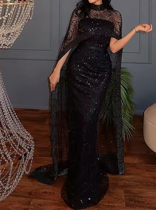 Sheath / Column Sweep / Brush Train Ball Gown with Cape Evening Gown Formal Dress Elegant Glittering Celebrity Style Sleeveless Crew Neck Formal Wedding Lace with Pearls Sequin 2025