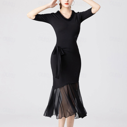 Latin Dance Ballroom Dance Dress Pure Color Splicing Tulle Women's Performance Training Half Sleeve High Cotton Blend