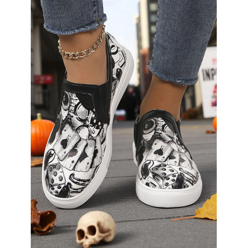 Women's Halloween Slip-On Sneakers - Colorful Graffiti Playing Card Print Canvas Skate Shoes for Casual Fall Outfits & Spooky Street Style